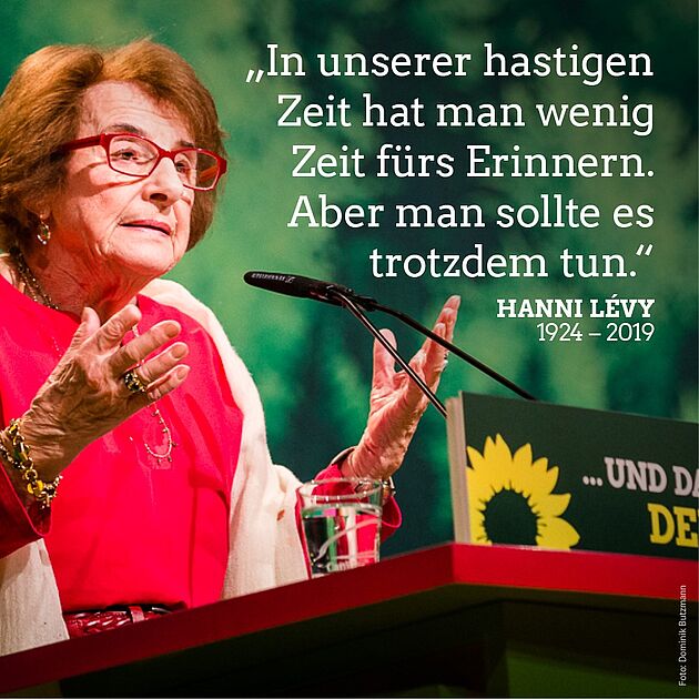 Sharepic von Bündnis 90/Die Grünen. Hanni Lévi auf dem Bundesparteitag 2018.